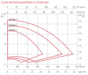 Ahora vamos a escoger la bomba que cumpla con esta capacidad. De igual forma, buscando como ejemplo en un catálogo de una marca de bomba muy reconocida mundialmente como ESPA encontramos que la bomba ideal para esta piscina es una SILEN S75 15, con una potencia de ¾ HP, cuya y ilustración y curva de desempeño se muestra a continuación: