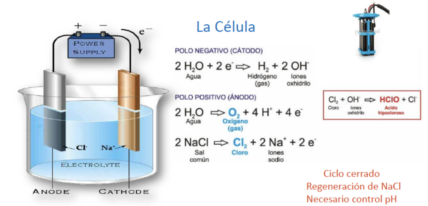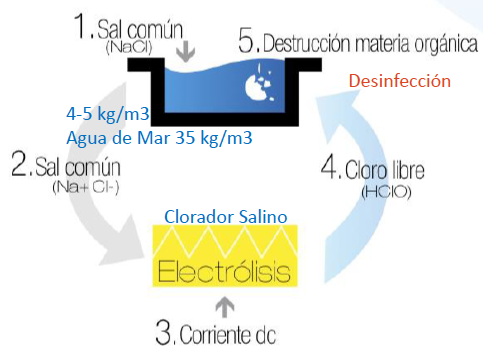 Consiste en utilizar sal y una celda de electrólisis para generar Cloro libre que al mezclarse con el agua actua como desinfectante y destruye la materia orgánica presente en el agua sin la acumulación de ácido isocianúrico que es muy peligroso para la salud en concentraciones superiores a las 100 ppm. Se requiere generar al menos 2 ppm de cloro por día por m3 de agua para mantener la piscina en óptimas condiciones.